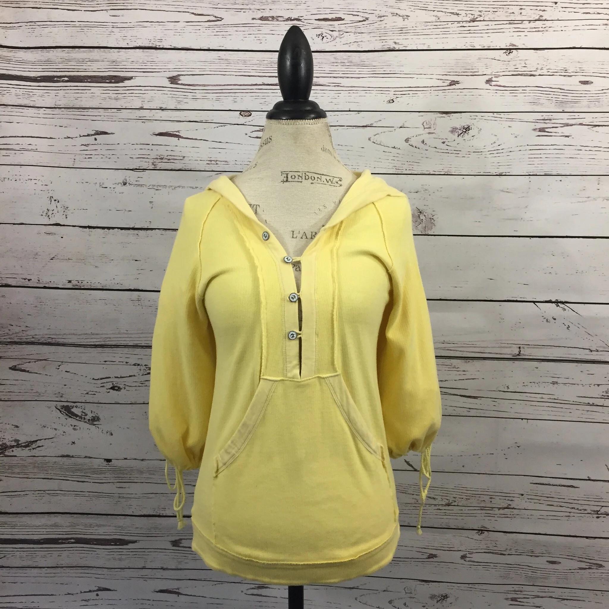I designed this piece while working for Colorado Trading & Clothing Co / Soybu. This was from a summer resort line that I worked on. The fabric is a blend of Polyester, Cotton, & Soy. The buttons are a white wash metal . The sleeves can be adjusted with the ties. Just a fun easy hoodie for the beach!